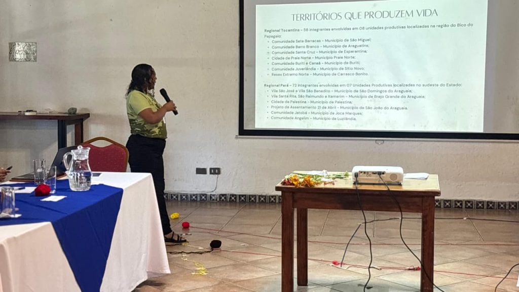 Durante o encontro, o Movimento Interestadual das Quebradeiras de Coco Babaçu (MIQCB) e a Cooperativa Interestadual das Mulheres Quebradeiras de Coco Babaçu (CIMQCB) compartilharam suas experiências em autogestão, produção coletiva e comercialização dos produtos da sociobiodiversidade.