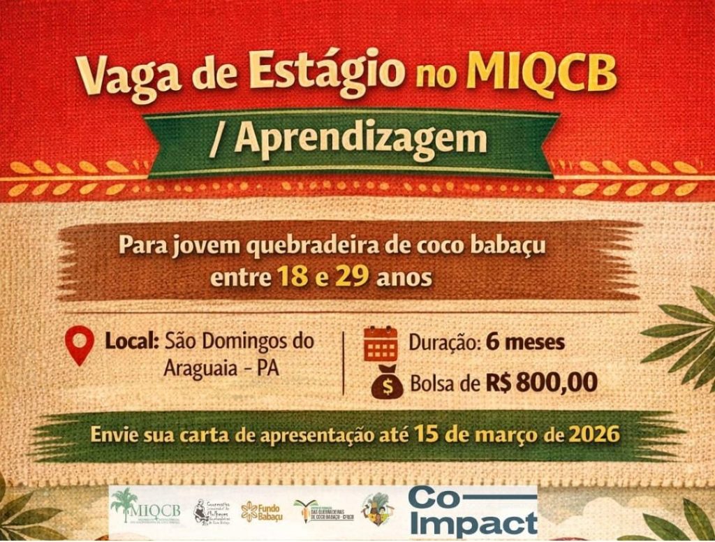 O Movimento Interestadual das Quebradeiras de Coco Babaçu (MIQCB) torna público o Edital nº 04/2026, que selecionará uma jovem mulher quebradeira de coco babaçu para atuar na Cachopa da Aprendizagem, na Regional Pará.