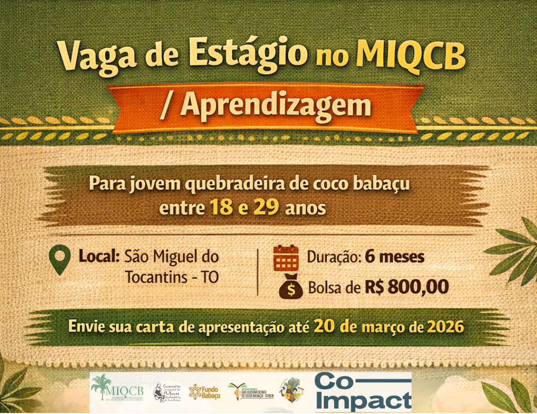 O Movimento Interestadual das Quebradeiras de Coco Babaçu (MIQCB) torna público o Edital nº 03/2026, que selecionará uma jovem mulher quebradeira de coco babaçu para atuar na Cachopa da Aprendizagem, na Regional Tocantins. A iniciativa integra o Projeto Educação em Movimento, apoiado pela Co-Impact, e tem como objetivo fortalecer a formação de mulheres e juventudes […]